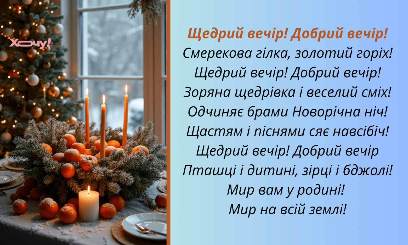 Щедрий вечір, який традиційно відзначають напередодні свята святого Василя, одне з улюблених свят українців. Наші пращури вірили, що в цей час межа між світами стає тонкою, а щирі побажання набувають магічної сили. Раніше ми публікували гарні вітання з Маланкою, а тепер “Хочу” подарує вам душевну добірку привітань із Щедрим Вечором.
